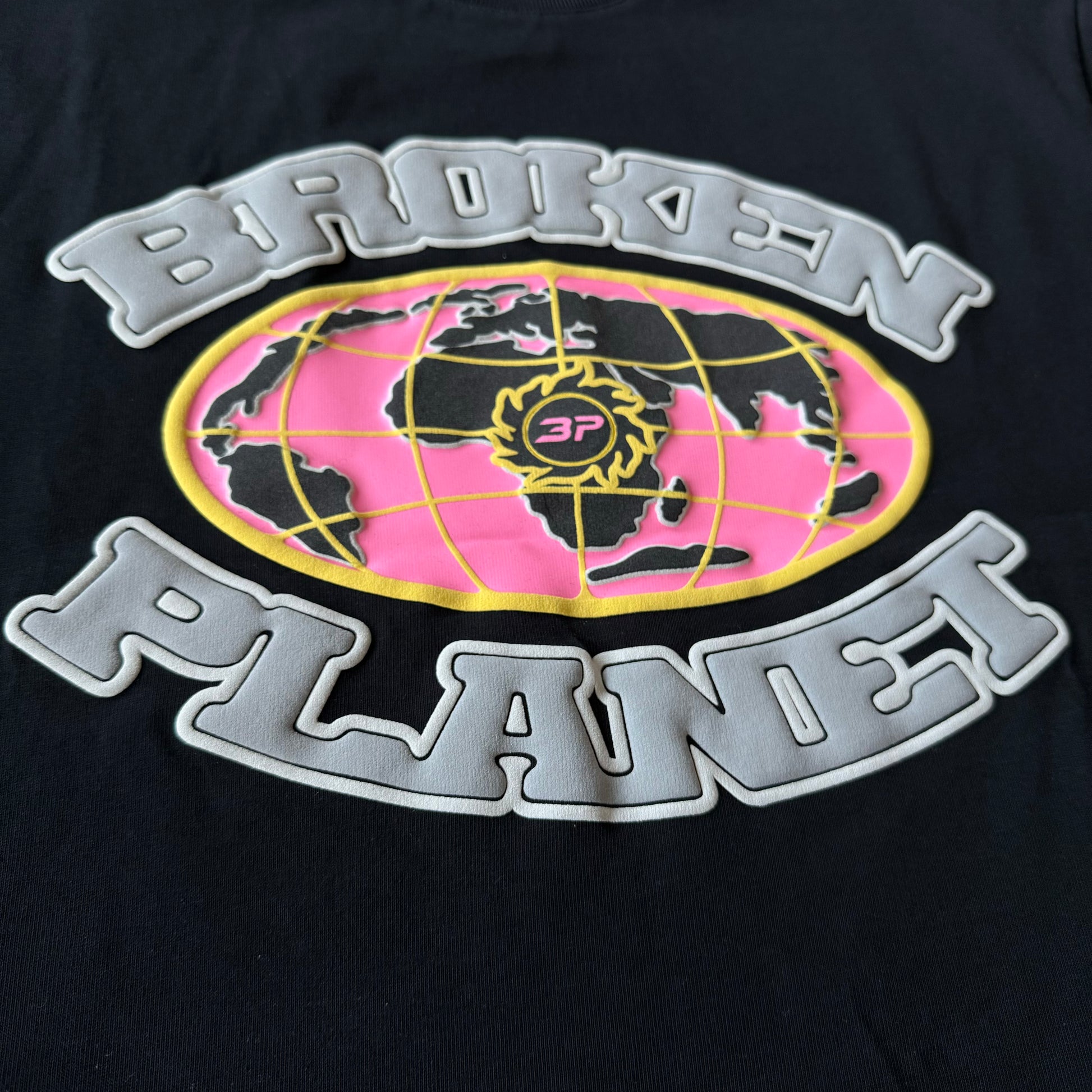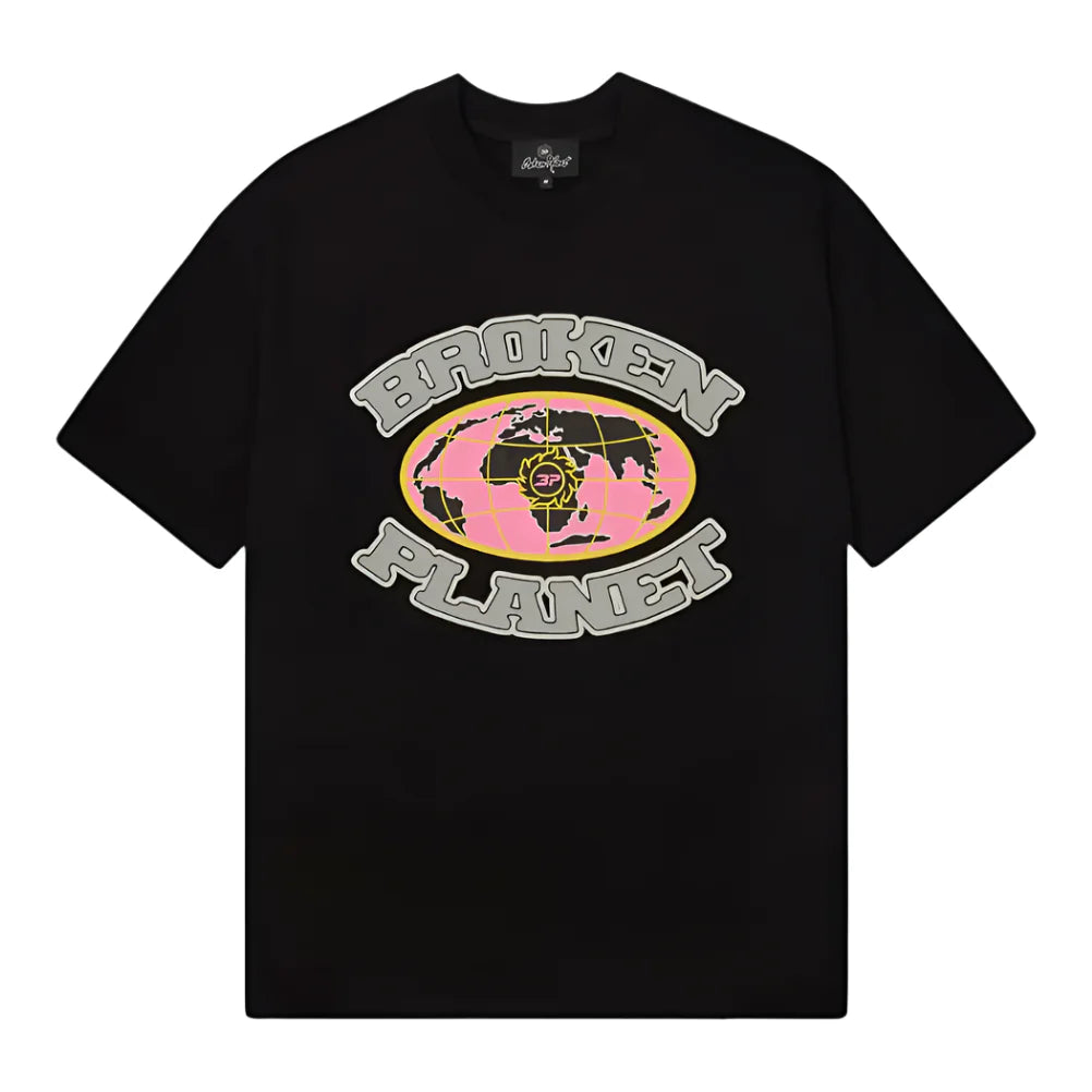 The Broken Planet Grid Tee brings a global vision to the streets, featuring a puff print world map graphic with "Broken" across the top and "Planet" at the bottom. The pink map, yellow grid lines, and BP logo at the center create a bold contrast on premium heavyweight cotton. Designed for a relaxed fit, this tee is a must have for those repping the movement.