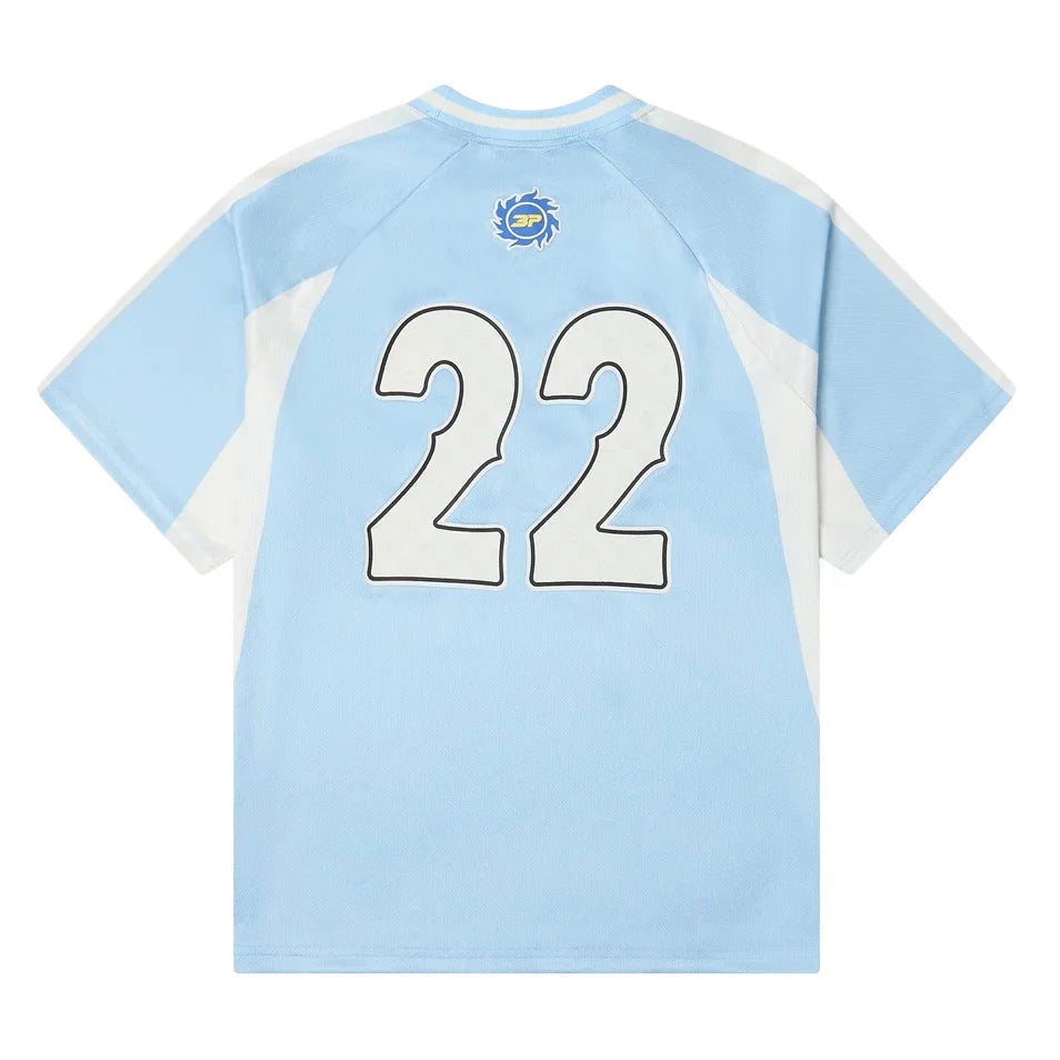 The Broken Planet Market Football Jersey in Light Blue is a standout piece, blending classic sportswear aesthetics with the brand's signature streetwear edge. This jersey features a premium breathable mesh fabric for a relaxed fit, perfect for layering or rocking solo. The number "22" is prominently displayed on the front and back, while the iconic Broken Planet logo sits on the left shoulder and upper back. The bold text print, designed with a black base and white stroke detailing, completes the look with a crisp contrast.