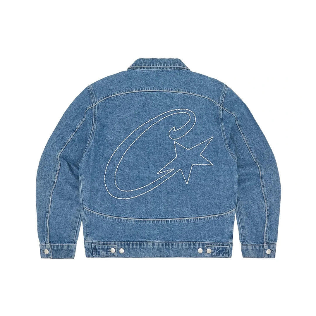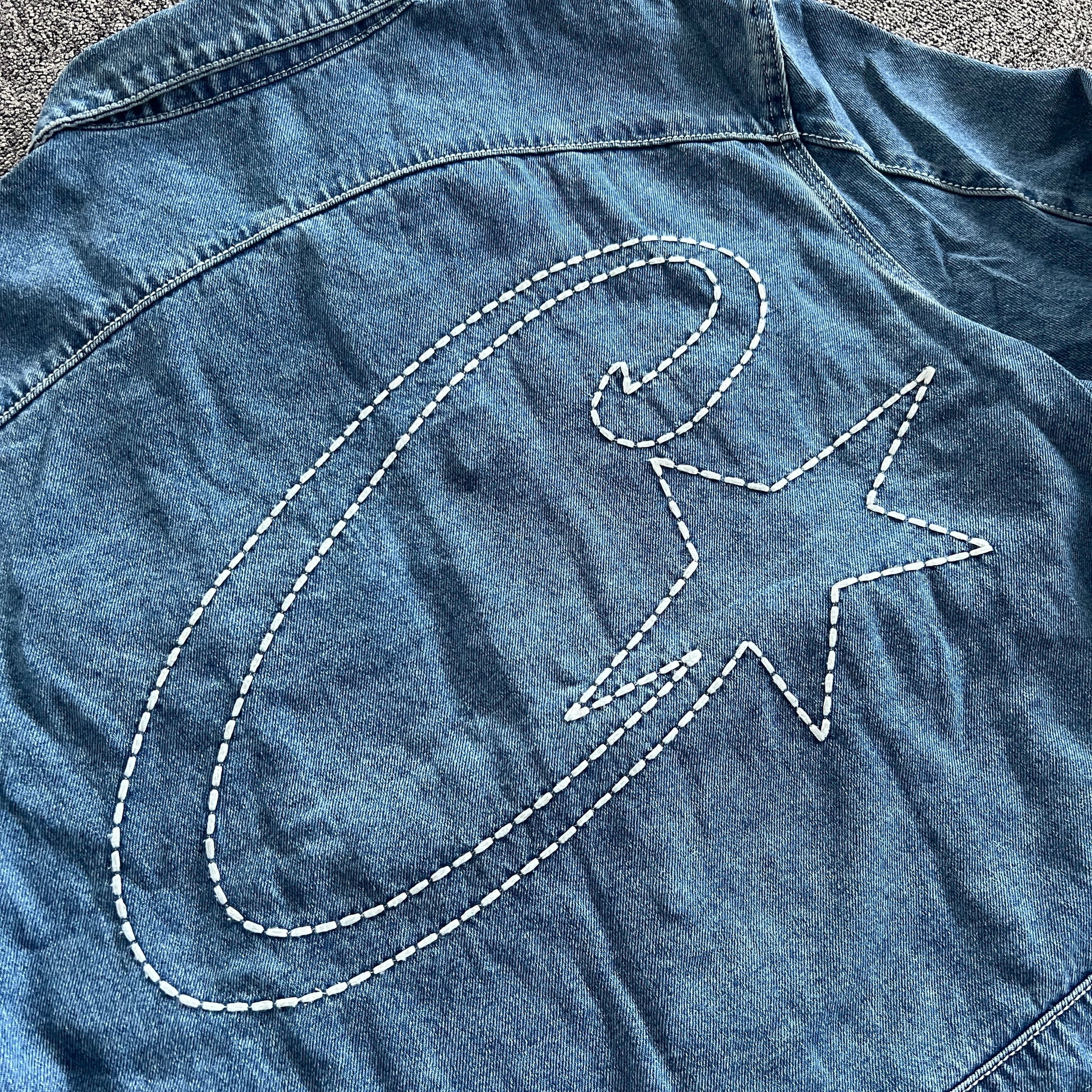 The Corteiz C-Star Denim Jacket in Black is a bold, timeless piece that blends streetwear edge with classic style. Crafted from durable denim, this jacket features the signature C-Star logo on the chest, adding a standout touch to its clean, minimalist design. With a relaxed fit and sturdy construction, it's built to withstand everyday wear while keeping you stylish. Whether you're layering up or rocking it solo, this jacket delivers on both comfort and statement. Available in sizes S, M, L, and XL.