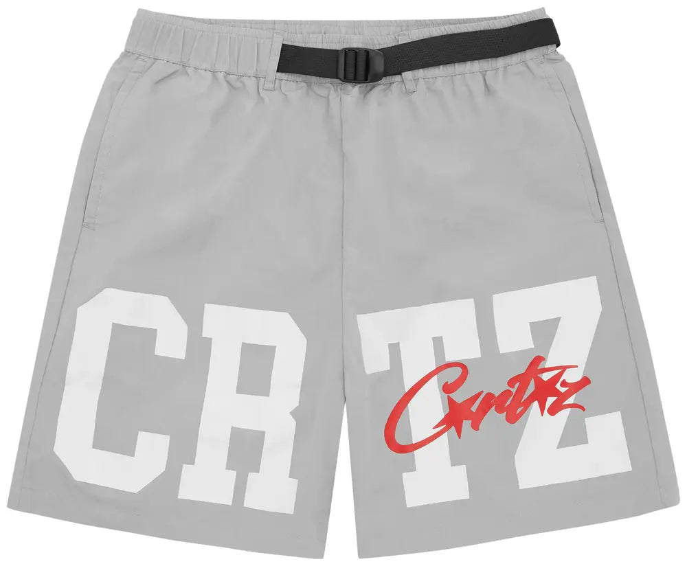 he Corteiz CRTZ Nylon Shorts in Grey bring a mix of comfort and street-ready style. Made from lightweight, durable nylon, these shorts feature an elastic waistband with adjustable drawstrings for a customizable fit. The front showcases the bold CRTZ logo printed above the knees, accompanied by a smaller red Corteiz logo for added detail. On the back, the iconic yellow rectangular "Litework" badge reinforces the brand’s signature aesthetic. A must-have for any wardrobe, these shorts are perfect for both casual and active wear.