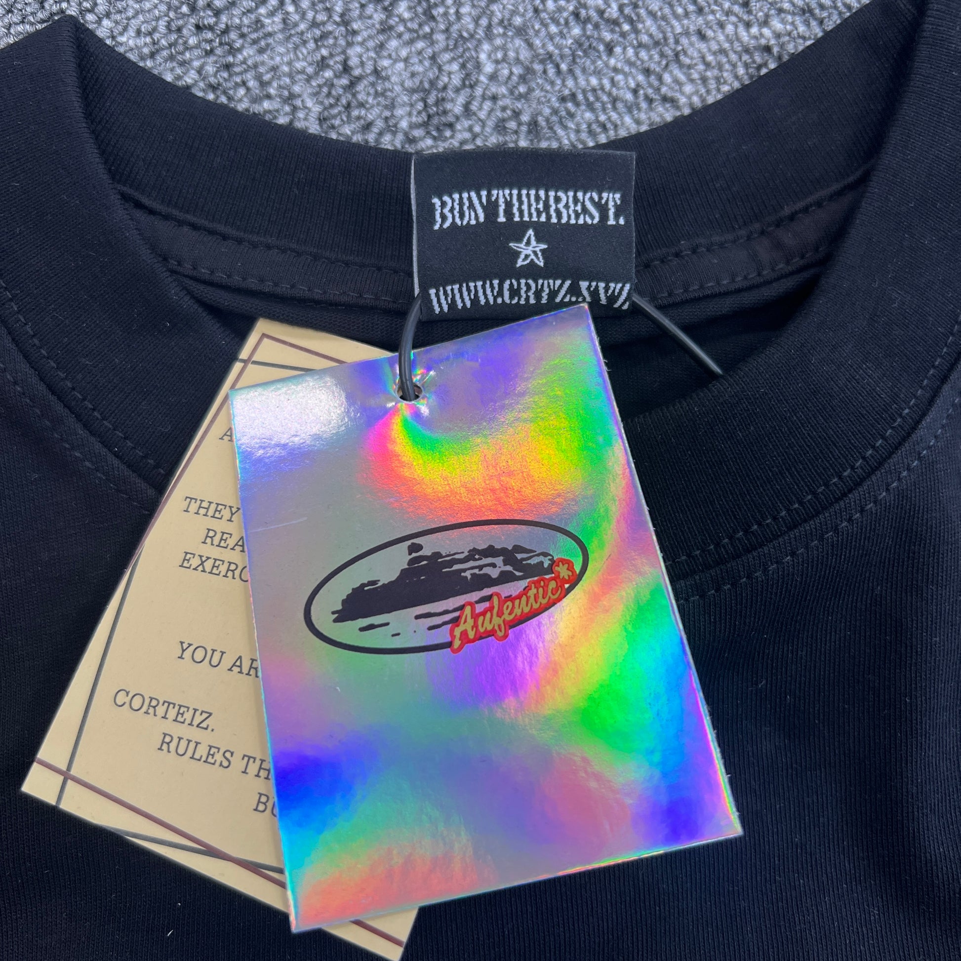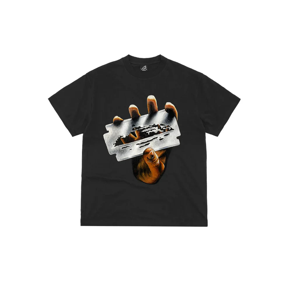 The Corteiz Razor Alcatraz Tee delivers a raw, rebellious edge with a bold front graphic. A hand grips a razor blade, featuring a cutout of Alcatraz Island, symbolizing danger and defiance. Detailed shading gives the design a striking, high-impact look, staying true to Corteiz’s fearless streetwear aesthetic.