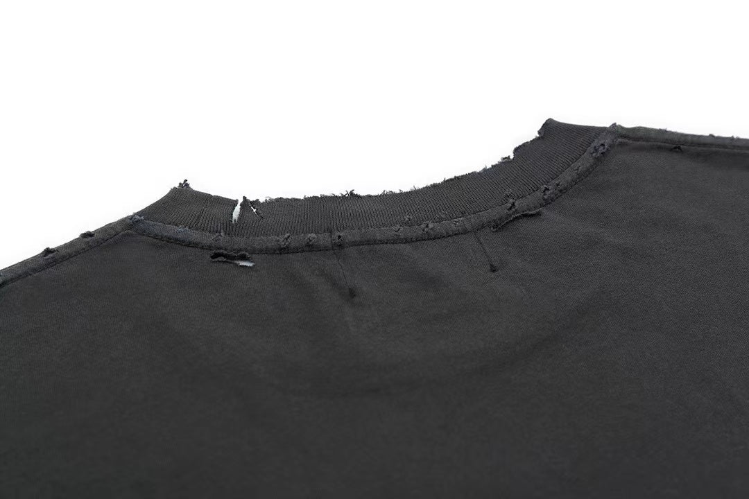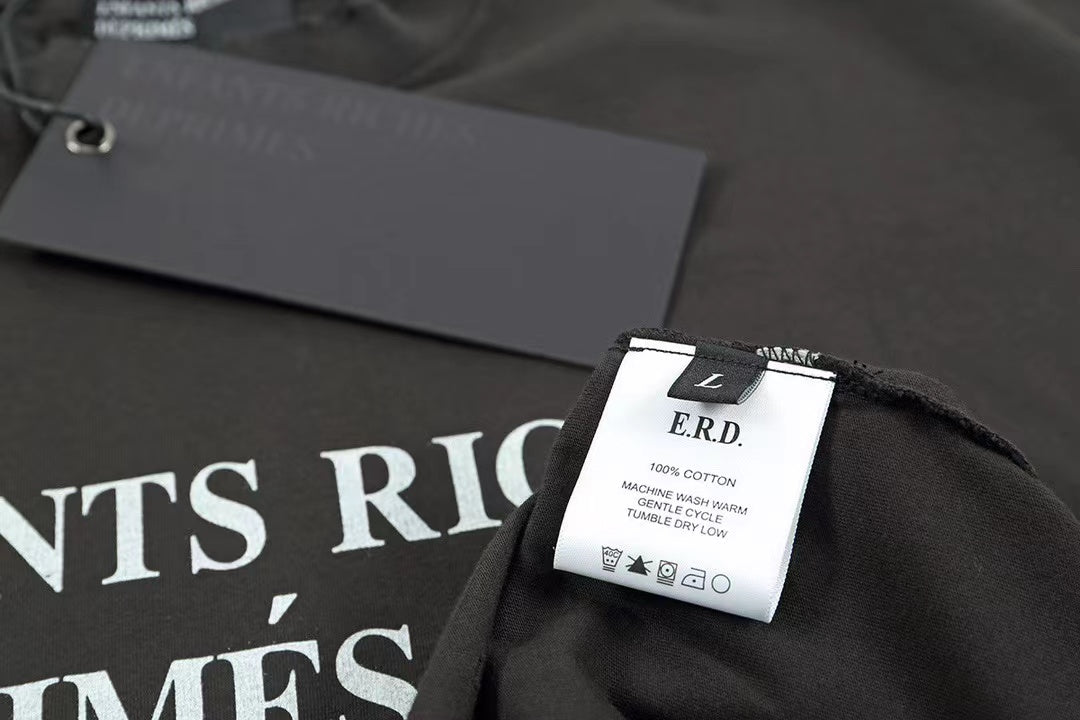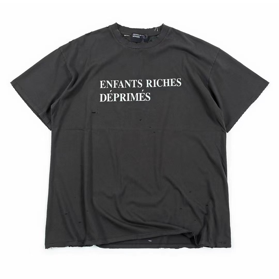 The Enfants Riches Déprimés Distressed Logo Tee blends luxury with a raw, rebellious aesthetic. Crafted from lightweight cotton jersey, this tee features a ribbed trim, distressed finish, and subtle ripped detailing for a worn-in, vintage look. The signature ERD logo print sits on the front, completing the edgy design. Finished with a round neck, short sleeves, and a curved hem, this piece is a statement in high-end grunge fashion.