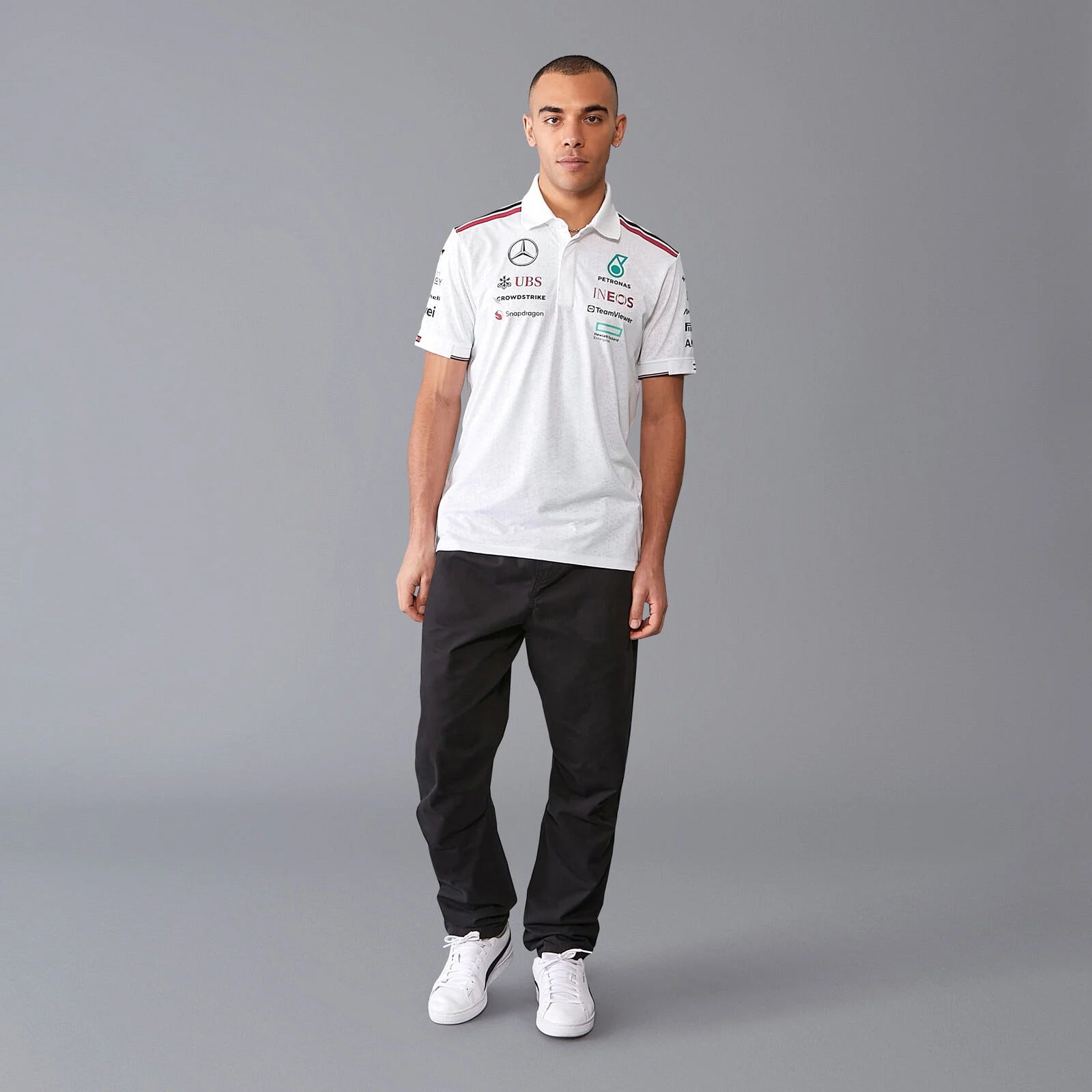 Red, white, and aqua team striping across the shoulders with PETRONAS, AMG, INEOS, Mercedes Benz, and more stitched across the chest, sleeves, and back. Button-up collar keeps it sharp. Teamwear done right 🏁