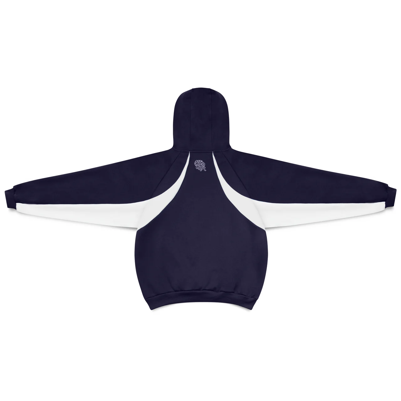 The Mertra Bigstep Tracksuit mixes comfort with sharp design, high neck hoodie with curved navy paneling, matching sweats with contrast pockets and adjustable hems. Embroidered logos on both pieces keep it minimal but hard.