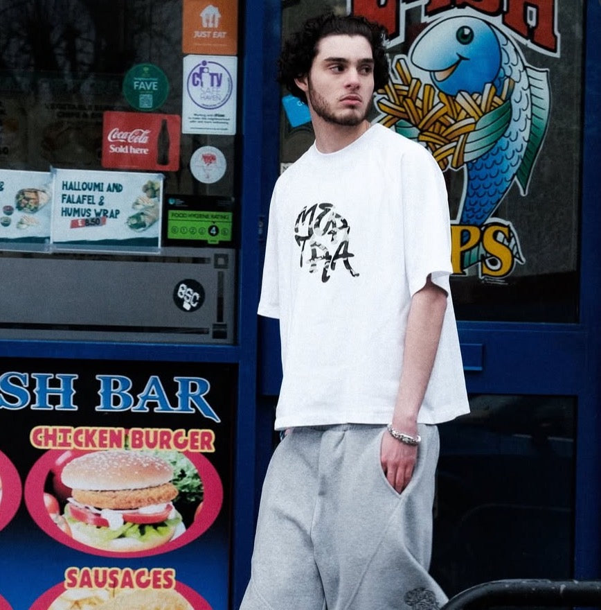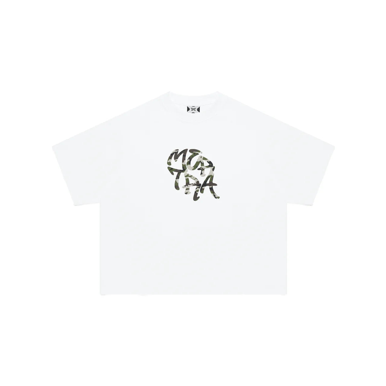 Mertra keeps it lowkey but bold with this camo glitch graphic front and centre. Oversized fit, clean white base, and that signature distorted logo that hits different.
