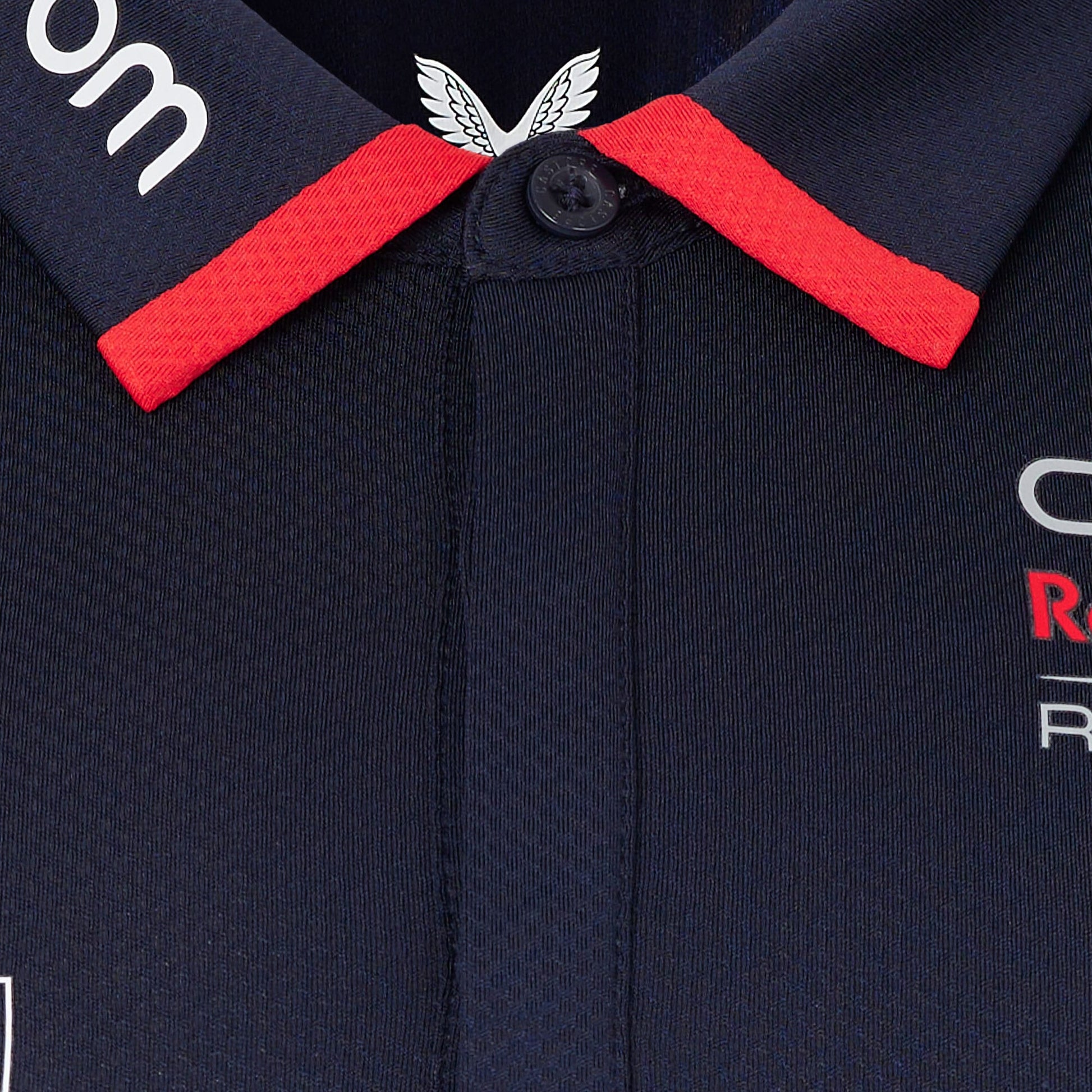 Navy blue base with sky blue stripes down the sides for a modern, sporty vibe. Featuring the Red Bull Racing logo on the front, with Castore branding and sponsor logos like TAG Heuer, Oracle, and Honda.