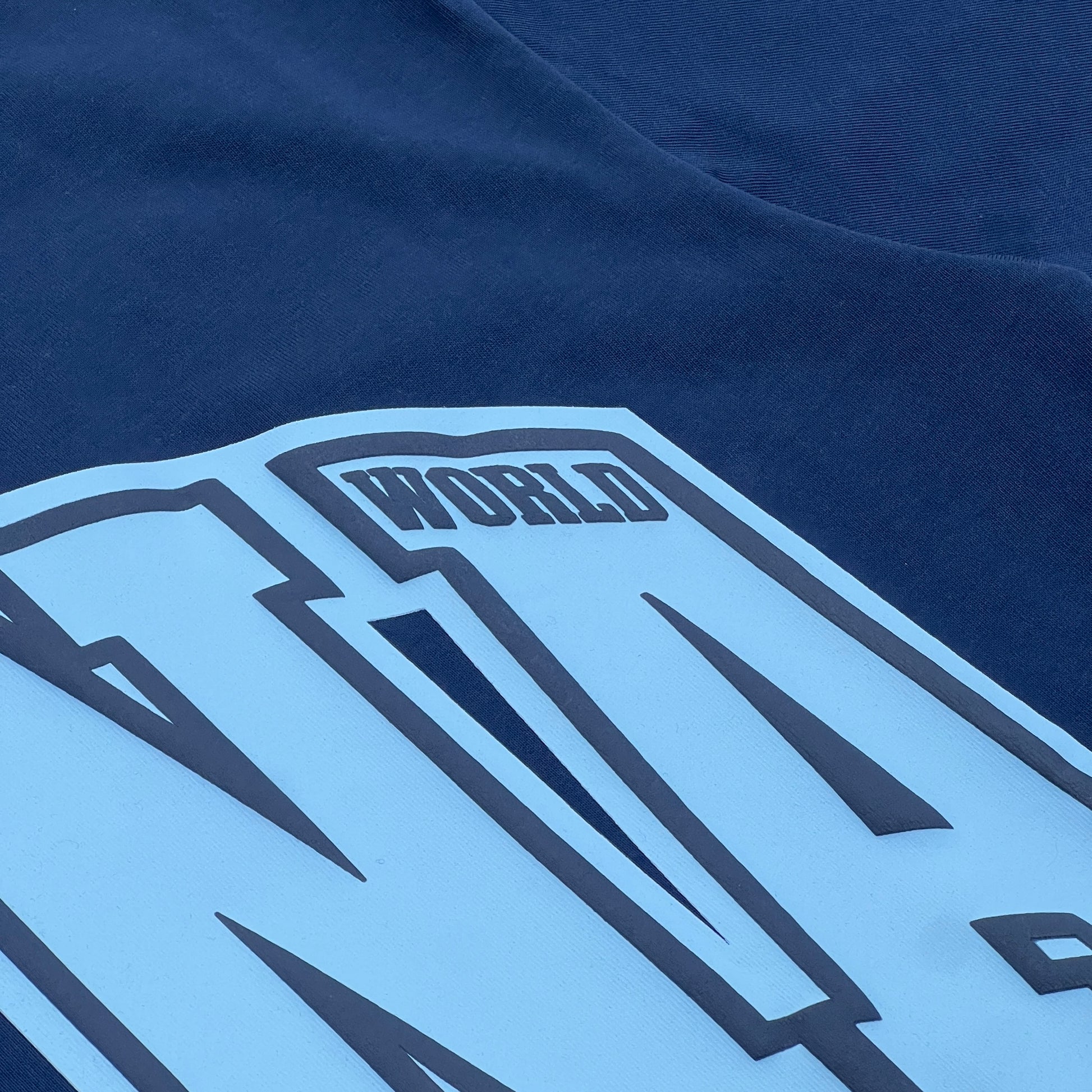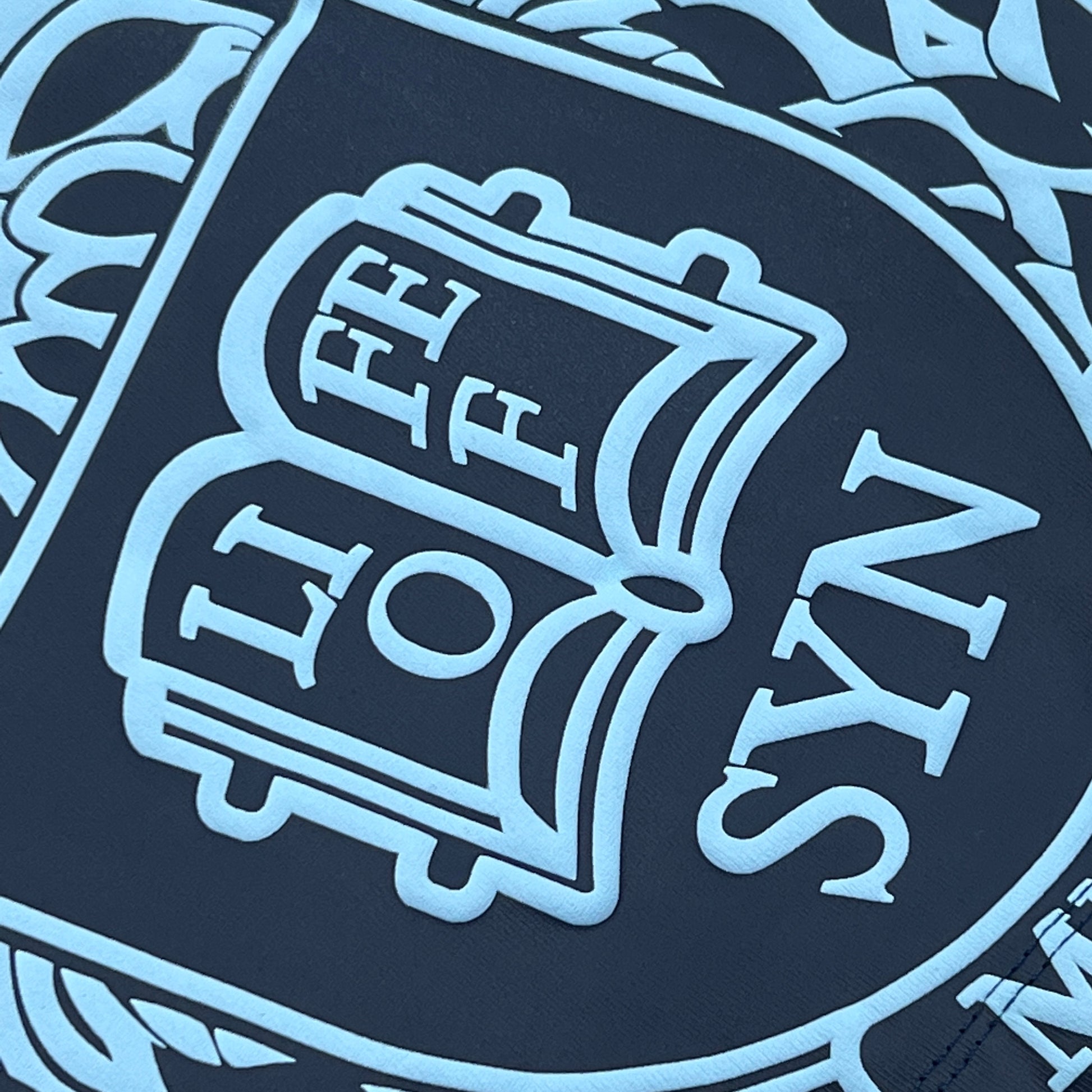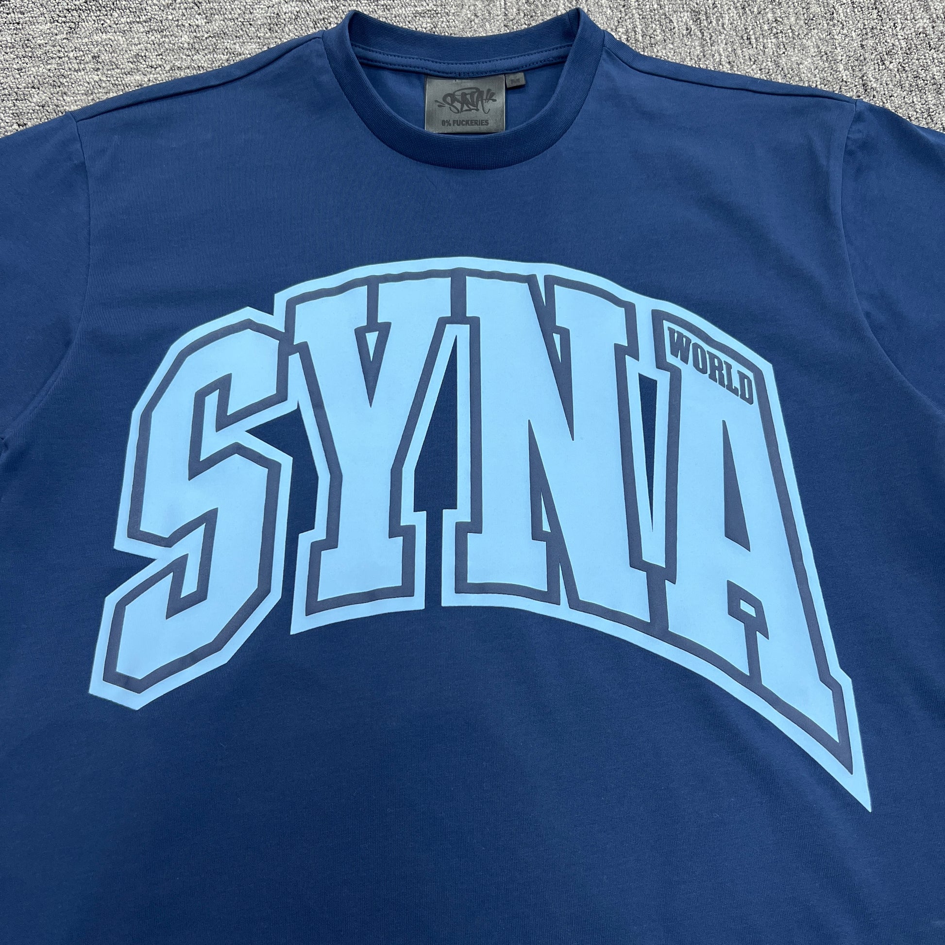 A structured short-sleeve tee featuring the SYNA WORLD collegiate-style logo printed in crisp white across the chest. The lower back showcases an oversized university-style crest with "LDN" and "Life of SYN" branding, adding to the elevated streetwear aesthetic. Crafted from heavyweight cotton for a premium feel, this tee offers a true-to-size fit with a clean, everyday look.