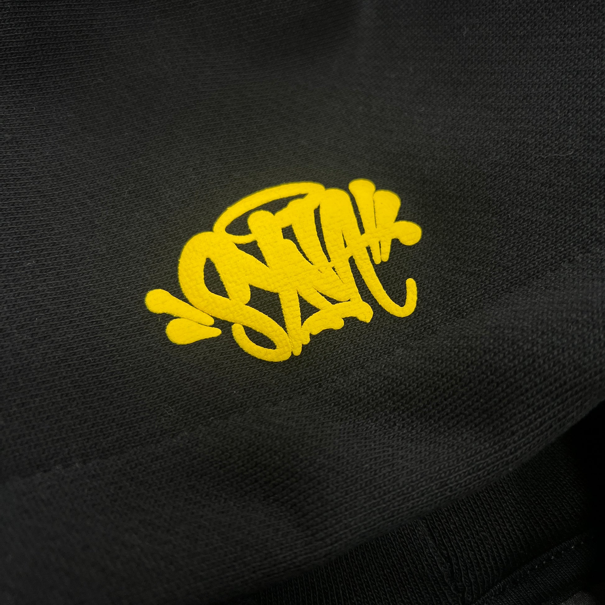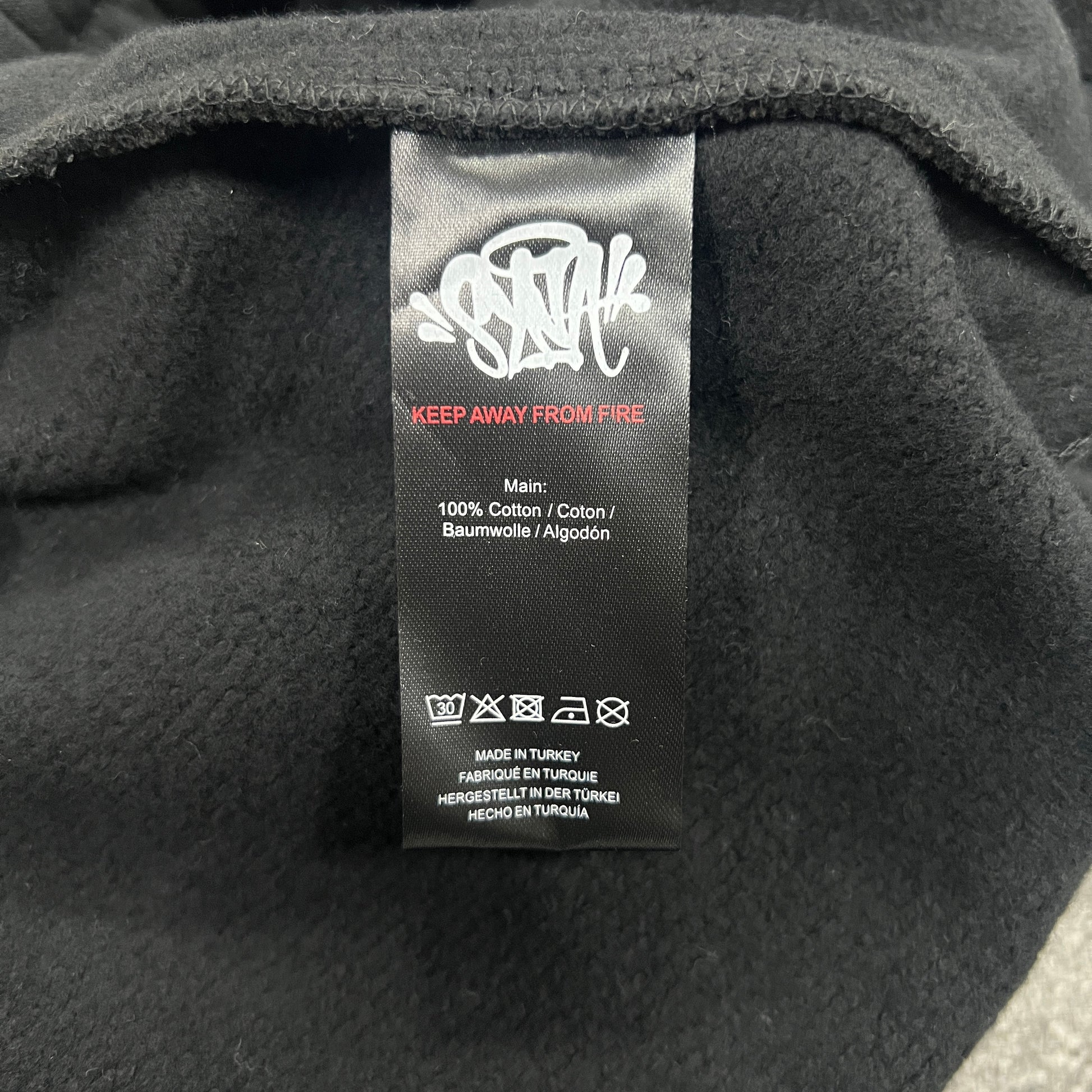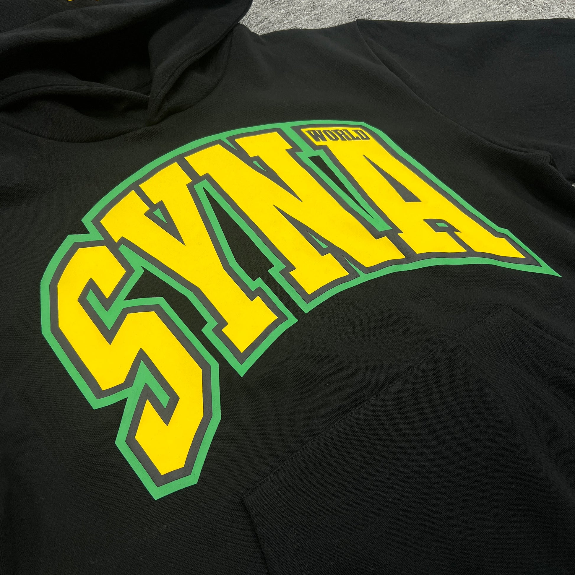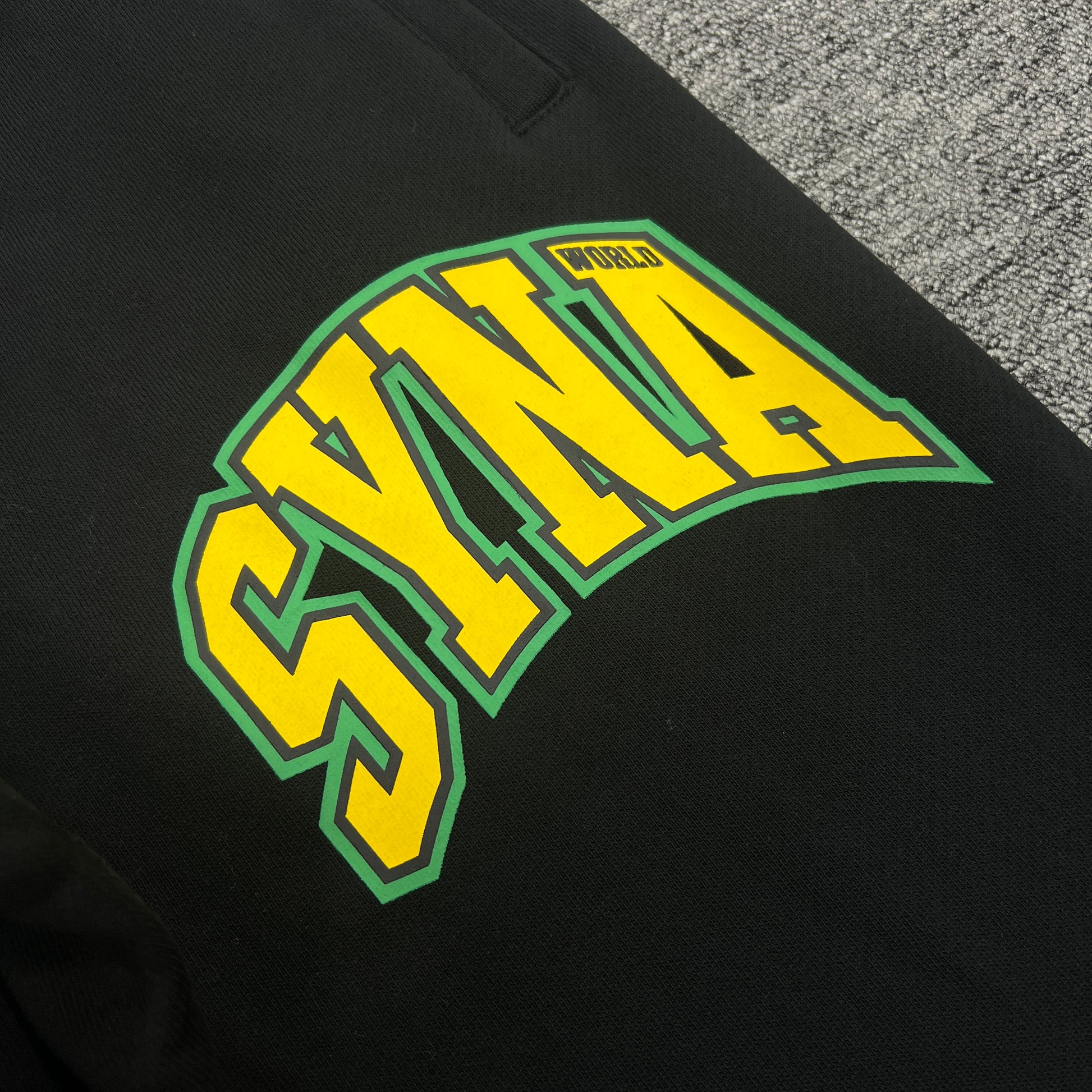 The Syna World College Tracksuit is a statement piece with a bold, collegiate-inspired design. Crafted from heavyweight 440g fabric, the hoodie provides premium warmth and structure, while the joggers maintain a relaxed yet fitted silhouette. The large arched "SYNA" branding on both the hoodie and pants adds a strong streetwear aesthetic, with additional logo detailing on the sleeve and pant leg. Featuring an adjustable hood, kangaroo pocket, elastic waistband, and cuffed hems, this tracksuit blends comfort and flex effortlessly.